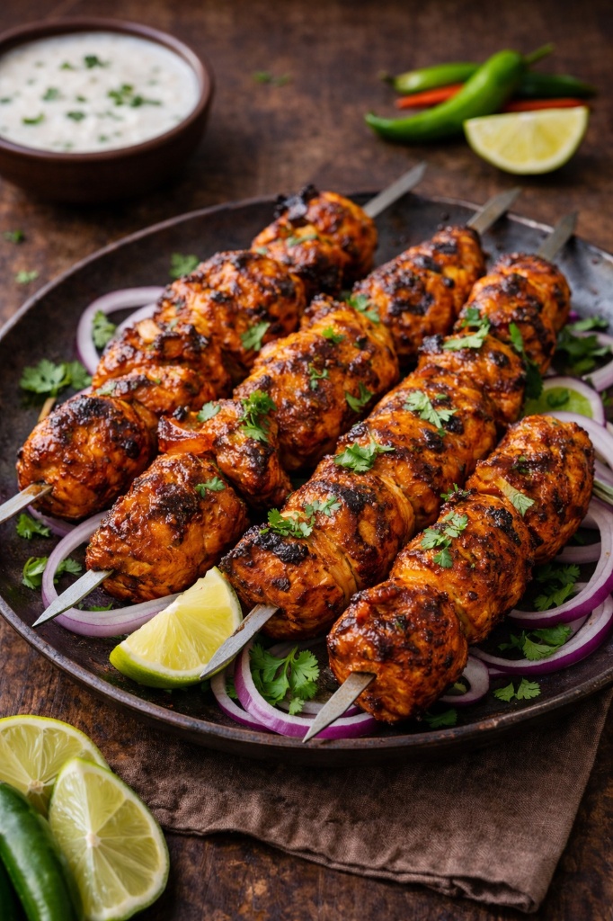 Boneless chunks of chicken marinated in a spicy yogurt blend and grilled over charcoal for a distinct smoky finish. These melt-in-your-mouth skewers are served with tangy mint chutney and fresh onion rings for perfection.